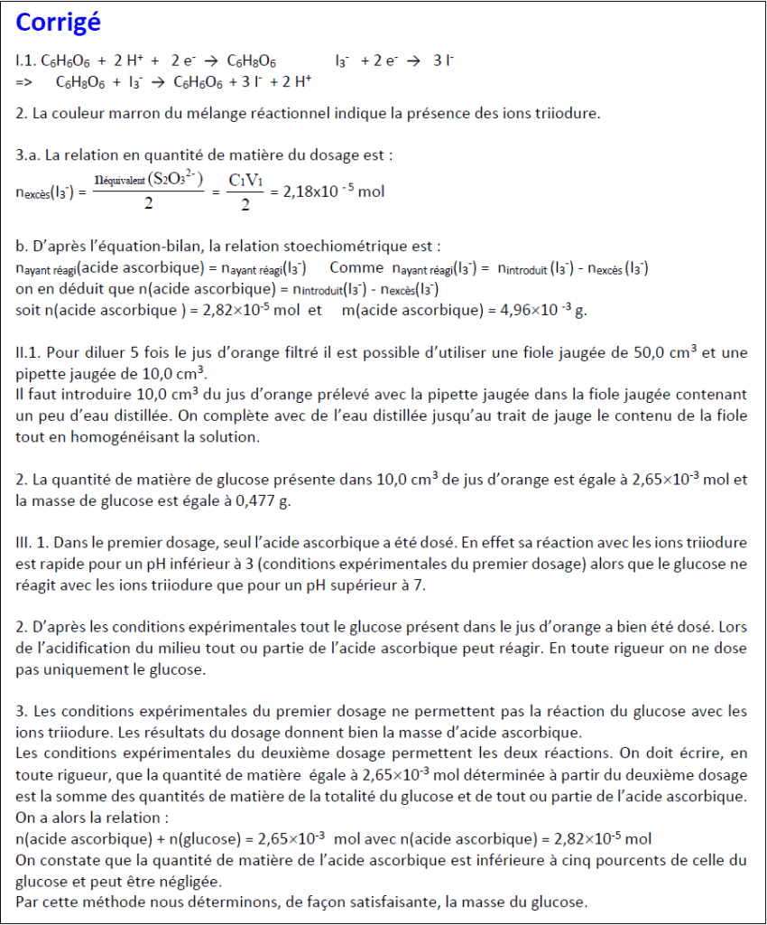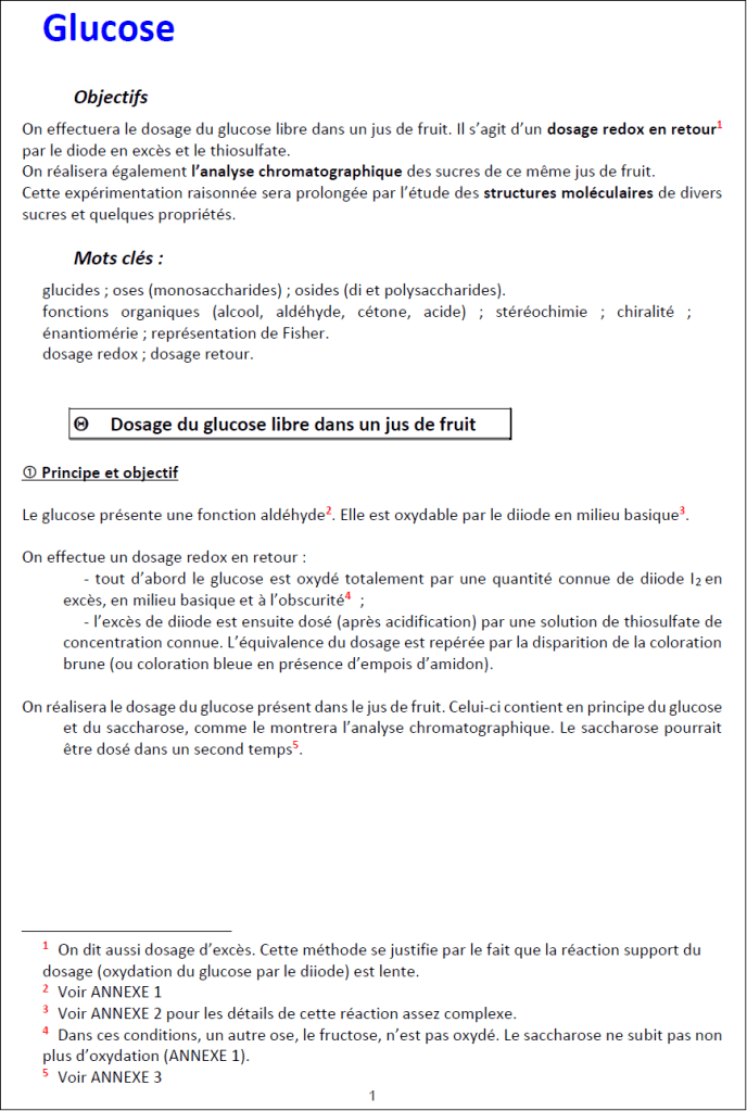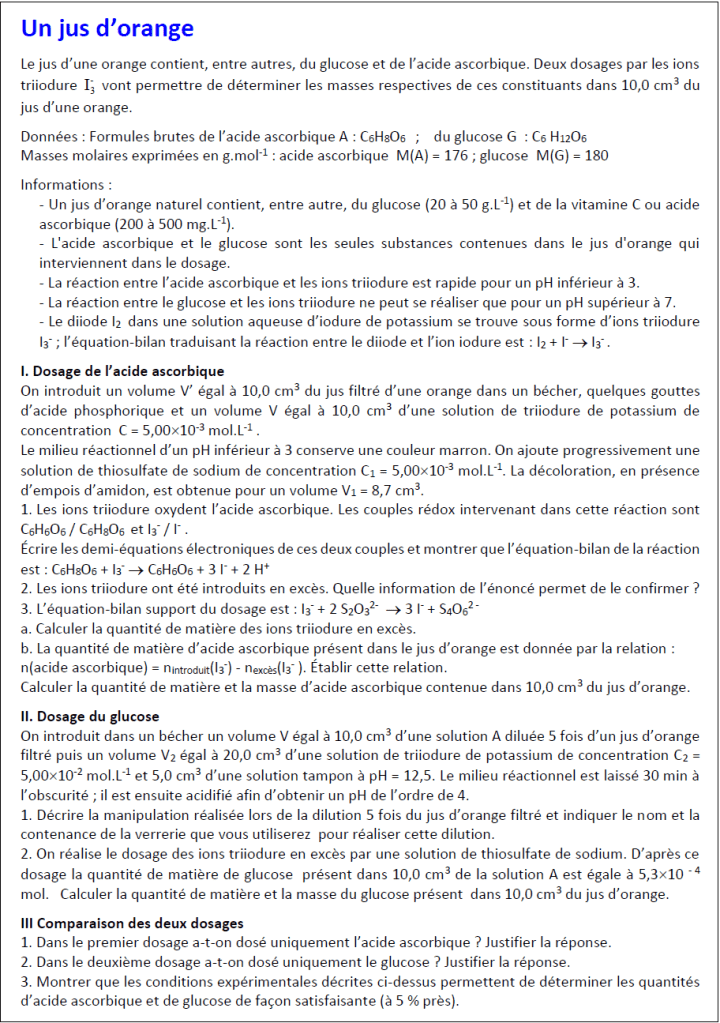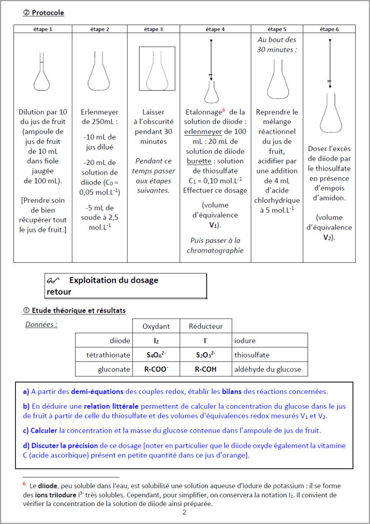 Il s’agit d’un travail expérimental classique : le dosage retour par le diiode du glucose libre dans un jus de fruit.