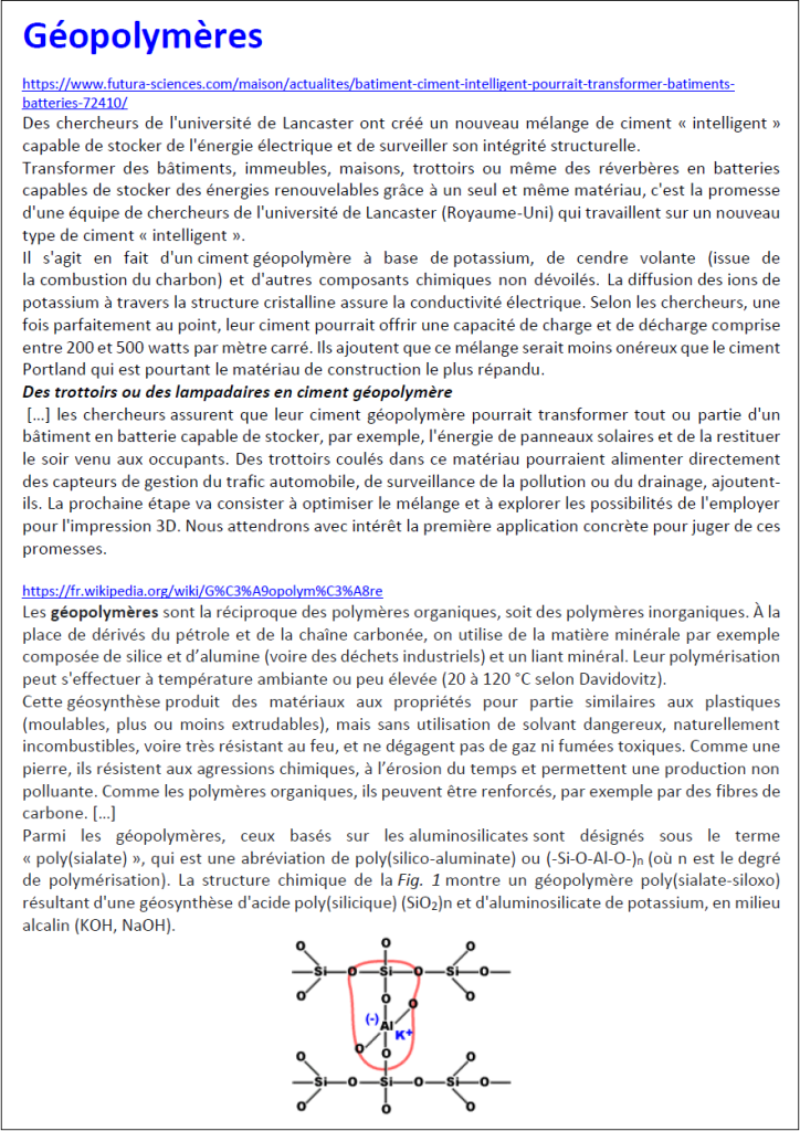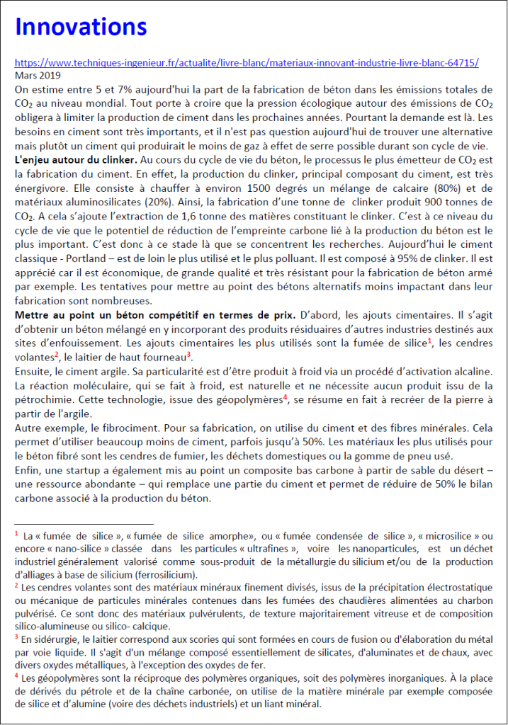 Il s’agit ici d’un travail d’exploitation de documents relatifs au ciment et ses propriétés ainsi que les problèmes associés et innovations en perspective.