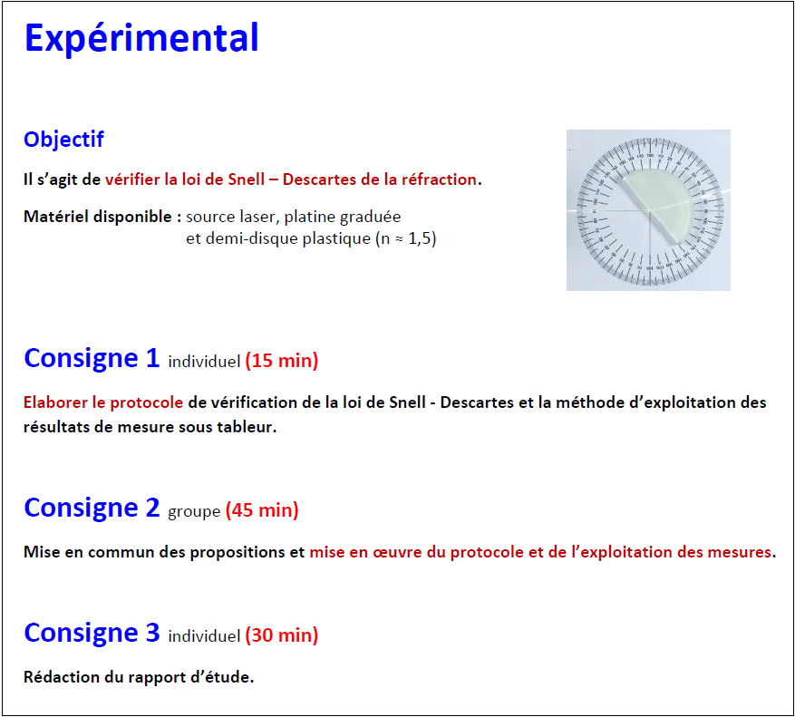 2. [experimental.pdf] : une étude expérimentale classique de vérification de la loi de Snell – Descartes avec élaboration préalable du protocole.