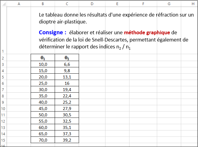 Consigne : élaborer et réaliser une méthode graphique de vérification de la loi de Snell-Descartes, permettant également de déterminer le rapport des indices n2 / n1. Corrigé : [mesures-corrige.xlsx]