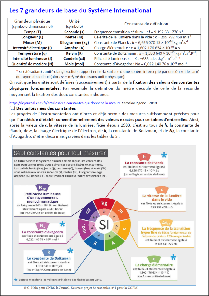 Le Système international d’unités (abrégé en SI), inspiré du système métrique, est le système d’unités le plus largement employé au monde ; mais il n’est pas officiellement utilisé aux États-Unis, au Liberia et en Birmanie. Il s’agit d’un système décimal (on passe d’une unité à ses multiples ou sous-multiples à l’aide de puissances de 10) sauf pour la mesure du temps et des angles. C’est la Conférence générale des poids et mesures, rassemblant des délégués des États membres de la Convention du Mètre, qui décide de son évolution, tous les quatre ans, à Paris. L’abréviation de « Système international » est SI, quelle que soit la langue utilisée. […] Les unités de base du Système international sont redéfinies lors de la conférence générale des poids et mesures du 13 au 16 novembre 2018 (à Versailles), à partir de sept constantes physiques dont la valeur exacte est alors « définitivement fixée ». Cette réforme entre en vigueur le 20 mai 2019.