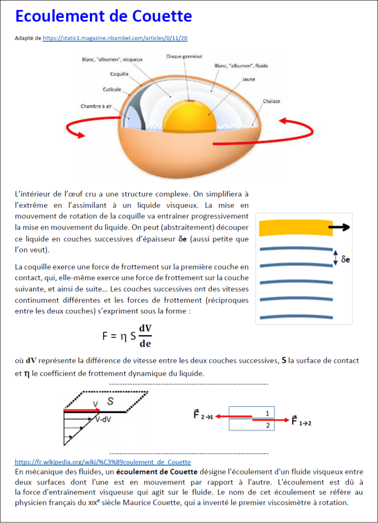 Après le travail individuel puis la mise au point en petit groupe, les hypothèses sont discutées en grand groupe (animation tableau). Le document de complément (traitant de l’écoulement de Couette) peut être utilisé en cours de travail en petit groupe. Le document proposant des explications peut être exploité après coup et donner lieu à nouveau à discussion.