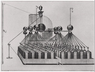 Ewald Jürgen Georg von Kleist (1700 – 1748) se sert d’une machine électrostatique archaïque (Otto von Guericke). Lorsqu’il pose la main sur la boule en faisant tourner l’axe rapidement, il constate la présence d’une charge d’électricité statique et se pose la question : « comment conserver cette charge ? » Pour stocker ce fluide appelé électricité, il eut, en 1744, une idée : Il enroule une feuille d’argent autour d’une bouteille en verre. Dans l’eau accidentellement impure qu’elle contient il plonge un très long fil de laiton qui traverse le bouchon ; il relie ce fil de laiton à la terre et charge la feuille à l’aide d’un générateur à friction. Cette invention est connue sous le nom de bouteille de Leyde parce qu’en 1746, Pieter van Musschenbroek (1692 – 1721) de l’université de Leyde, Pays-Bas, fait de manière indépendante la même découverte, mais est le premier à combiner plusieurs bouteilles en parallèle dans une « batterie » pour augmenter la capacité totale ce qui lui vaut une réputation mondiale.