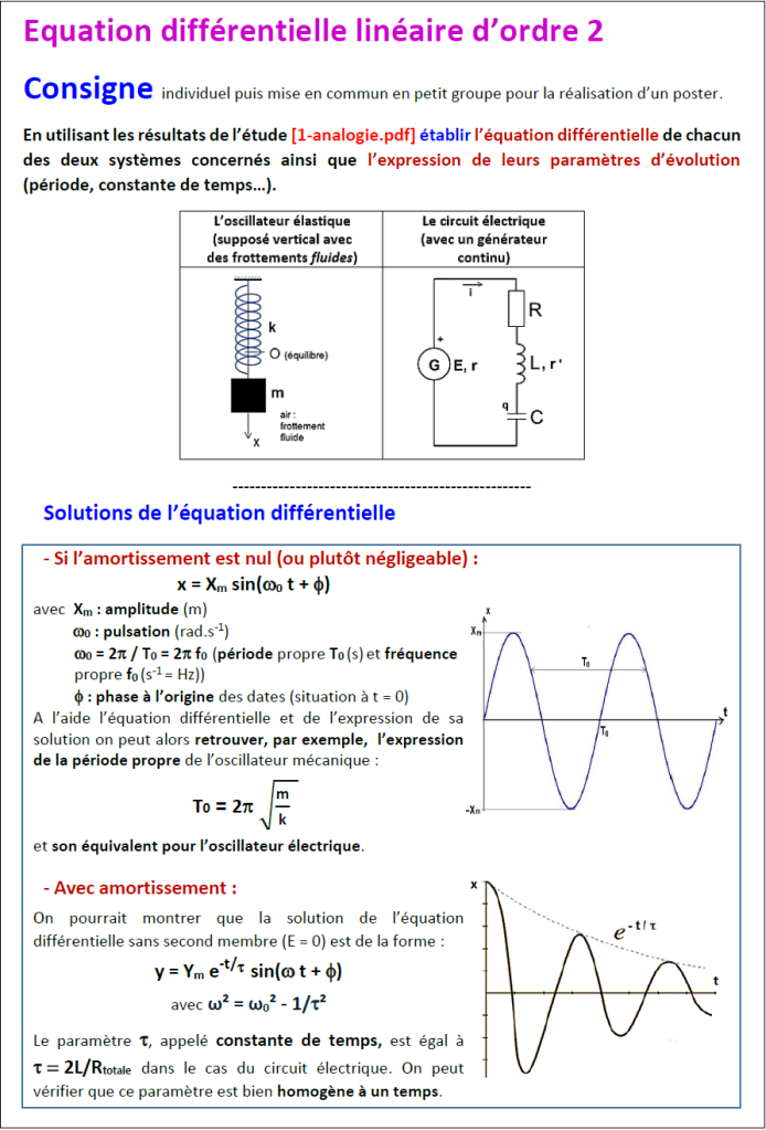 Les travaux proposés ici construisent cette analogie électromécanique, jusqu’au traitement des équations différentielles linéaires d’ordre 2, sans ou avec amortissement.
