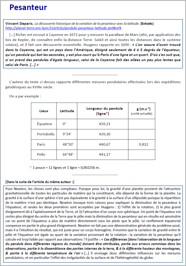 Cependant quelques savans croient que cette méthode a des inconvéniens. Selon eux, pour réussir à la rendre universelle, il faudroit que la pesanteur fût la même à tous les points de la surface de la terre. En effet, la pesanteur étant la seule cause de l’oscillation du pendules, & cette cause étant supposée rester la même, il est certain que la longueur du pendule qui bat les secondes, devroit être invariable, puisque la durée des vibrations dépend de cette longueur, & de la force avec laquelle les corps tombent vers la terre. Par conséquent, la mesure qui en résulte seroit universelle pour tous les pays & pour tous les tems ; car nous n’avons aucune observation qui nous porte à croire que l’action de la gravité soit différente dans les mêmes lieux en différens tems. Mais des observations incontestables ont fait connoître que l’action de la pesanteur est différente dans differens climats, & qu’il faut toujours alonger le pendule vers le pole, & le raccourcir vers l’équateur. Ainsi, on ne sauroit espérer de mesure universelle que pour les pays situés dans une même latitude. […]