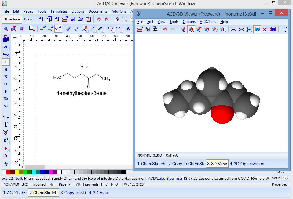Exemple d’activité de formulations et visualisations moléculaires mettant en œuvre un logiciel approprié (ici ACDLabs-ChemSketch).