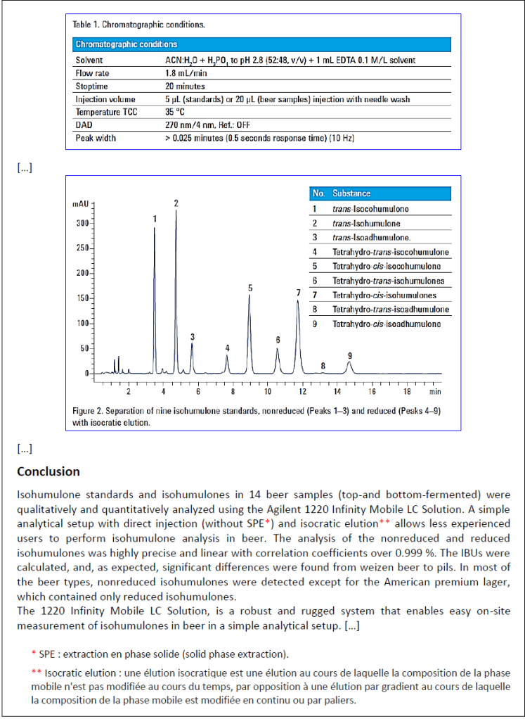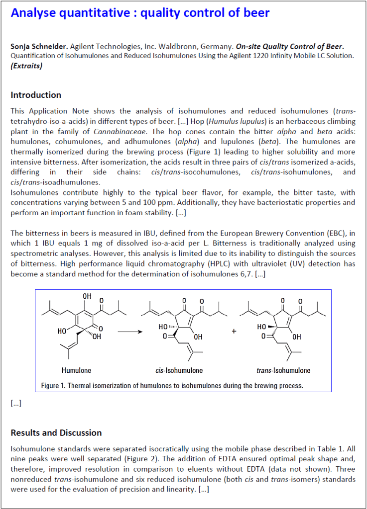 On prend ici prétexte de la mesure de l’amertume de la bière (IBU) pour aborder la méthode d’analyse chromatographique à haute performance (HPLC). Il s’agit d’un dossier documentaire pouvant donner lieu à une exploitation partagée (travail individuel sur une partie des documents puis mise en commun en petit groupe avec la réalisation d’un poster…). Les contenus donnant lieu à un travail de synthèse sont par exemple : les structures moléculaires (acides alpha et béta) et isomérisations ; l’analyse quantitative chromatographique HPLC : principe, exemples de résultats…