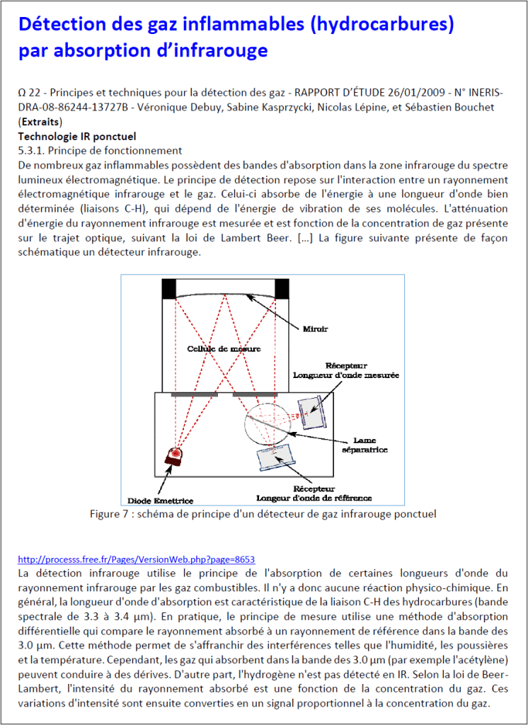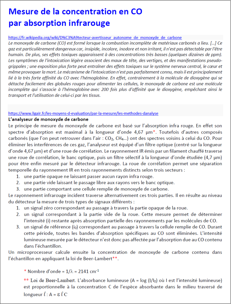 L’absorbance sélective des infrarouges permet la mesure de concentration dans l’air de gaz tels, entre autres, que le CO (très toxique par fixation sur l’hémoglobine) et le CO2 (toxique par acidose à concentration supérieure à 3%) ou encore les hydrocarbures (inflammables). Les documents proposés permettent l’étude du principe des mesures : choix des longueurs d’onde des infrarouges utilisables selon le gaz concerné, loi de Beer-Lambert pour le quantitatif…