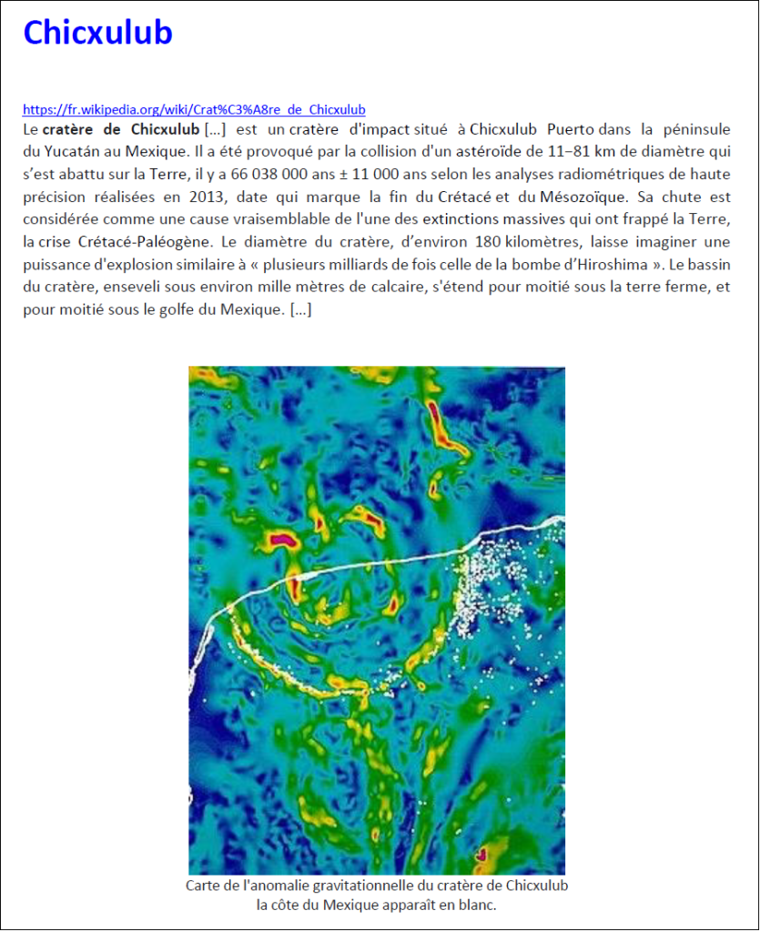 Impacts remarquables. Par le passé plusieurs objets géocroiseurs de grande taille sont entrés en collision avec la Terre et ont fortement marqué l’histoire de notre planète. En 2014 on avait identifié environ 140 cratères d’impact à la surface de la Terre. Certains de ces impacts sont plus connus parce qu’ils ont laissé un témoignage au sol spectaculaire ou ont eu un impact très fort sur l’évolution du vivant ou encore parce qu’ils se sont produits à l’époque moderne. Le plus connu, qui subsiste à l’état de trace, est le cratère de Chicxulub (180 kilomètres de diamètre situé au Mexique), provoqué par l’impact d’un objet de plus de 10 kilomètres de diamètre il y a 66 millions d’années. La catastrophe résultante serait à l’origine de l’extinction massive du Crétacé Tertiaire qui a entrainé la disparition d’une grande partie des espèces animales dont les dinosaures. Le Meteor Crater (1,2 kilomètre de diamètre), situé aux États-Unis, résulte de l’impact d’un astéroïde de 45 mètres de diamètre qui s’est écrasé il y a 50 000 ans. À l’époque moderne l’événement de la Toungouska qui s’est produit en Sibérie en 1908 est attribué à l’explosion à haute altitude d’un astéroïde ou d’un morceau de comète d’une taille comprise entre 50 et 200 mètres. 2 000 km2 de forêt ont été détruits par ce phénomène qui s’est déroulé au-dessus d’une région inhabitée. Plus récemment le superbolide de Tcheliabinsk un astéroïde d’environ 15 mètres de diamètre circulant à une vitesse de 18 km/s s’est pratiquement complètement désintégré dans le ciel au-dessus de la ville éponyme en Sibérie en 2013. Environ 1 500 personnes ont été blessées par les éclats de vitre brisées par les explosions.