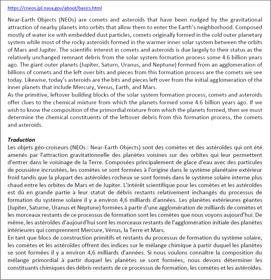Un objet géocroiseur (ou NEO, de l’anglais Near Earth Object) est un astéroïde ou une comète du système solaire que son orbite autour du Soleil amène à faible distance de l’orbite terrestre, et donc potentiellement à proximité de la Terre. Compte tenu de leur masse et de leur vitesse, les objets géocroiseurs peuvent entrainer une catastrophe humaine majeure éventuellement planétaire même si la probabilité d’un tel impact est extrêmement faible. […]