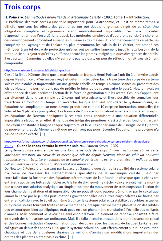 Quand le chaos détruira le système solaire… Laurent Sacco – 2009. De Newton à Poincaré en passant par Laplace et Gauss, la question de la stabilité du système solaire n’a cessé de tracasser les mathématiciens spécialistes de la mécanique céleste. C’est par cette faille dans la forteresse des équations déterministes de la mécanique classique que la chaos est entré et a acquis ses lettres de noblesse. A la fin du dix-neuvième siècle, Poincaré avait même montré que trouver une solution analytique au simple problème du mouvement de trois corps sous l’action de leur champ de gravitation était impossible. […]