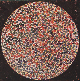 Colorés en orangé, vert et violet, et mélangés, les grains ont été saupoudrés sur la plaque de verre revêtue d’un enduit poisseux. Ils sont au nombre de 8000 à 9000 par millimètre carré. Mais ils n’ont pas encore été écrasés au laminage, et les intervalles microscopiques qui les séparent laissent filtrer de la lumière blanche.