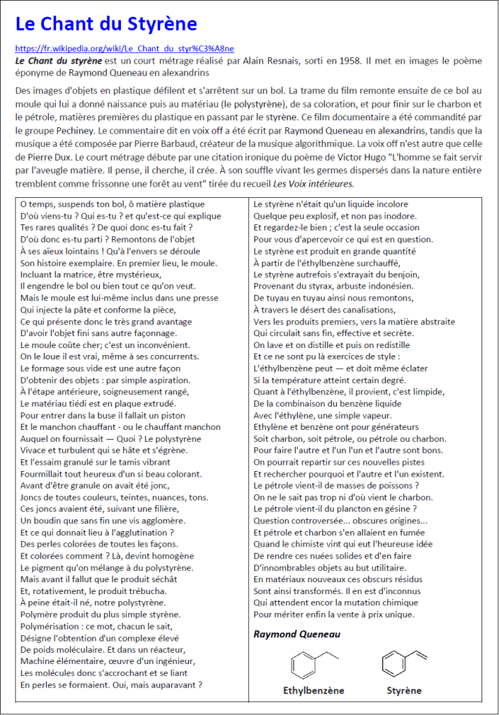Une petite collection documentaire autour du styrène et son polymère, à partir du poème de Raymond Queneau et du film d’Alain Resnais (1958) « le Chant du Styrène ».