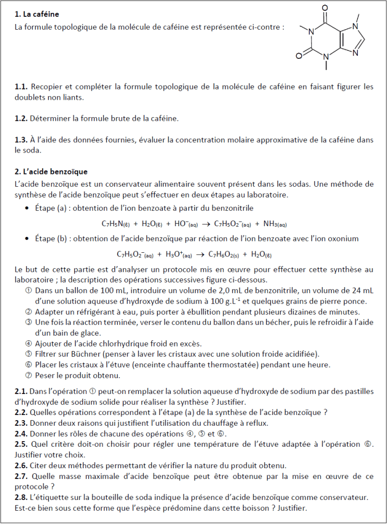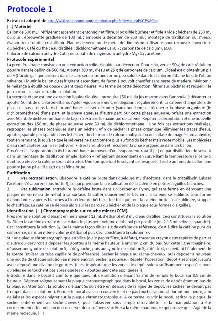 Trois exemples sont disponibles pour élaborer et mettre en œuvre un protocole permettant d’obtenir et identifier la caféine.