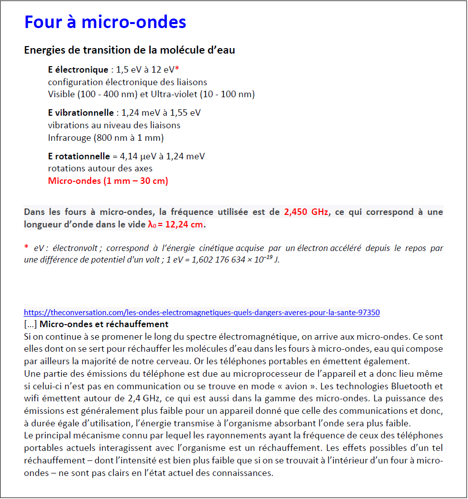 Micro-ondes et réchauffement. Si on continue à se promener le long du spectre électromagnétique, on arrive aux micro-ondes. Ce sont elles dont on se sert pour réchauffer les molécules d’eau dans les fours à micro-ondes, eau qui compose par ailleurs la majorité de notre cerveau. Or les téléphones portables en émettent également. Une partie des émissions du téléphone est due au microprocesseur de l’appareil et a donc lieu même si celui-ci n’est pas en communication ou se trouve en mode « avion ». Les technologies Bluetooth et wifi émettent autour de 2,4 GHz, ce qui est aussi dans la gamme des micro-ondes. La puissance des émissions est généralement plus faible pour un appareil donné que celle des communications et donc, à durée égale d’utilisation, l’énergie transmise à l’organisme absorbant l’onde sera plus faible. Le principal mécanisme connu par lequel les rayonnements ayant la fréquence de ceux des téléphones portables actuels interagissent avec l’organisme est un réchauffement. Les effets possibles d’un tel réchauffement – dont l’intensité est bien plus faible que si on se trouvait à l’intérieur d’un four à micro-ondes – ne sont pas clairs en l’état actuel des connaissances.