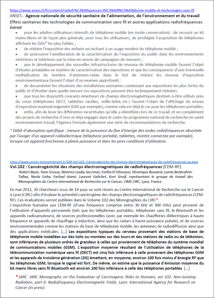 Des précautions peu coûteuses, en attendant d’en savoir plus. […] Dans l’attente de davantage de connaissances, des précautions ont été émises par les agences sanitaires. Celles de l’Anses, l’agence nationale de sécurité sanitaire de l’alimentation, de l’environnement et du travail française, sont notamment de limiter l’utilisation de téléphones par les enfants, de ne pas garder son téléphone sur soi ni dormir à côté, de téléphoner en utilisant un casque filaire permettant de ne pas coller le téléphone contre sa tête, ou encore de privilégier l’achat de téléphones affichant un faible niveau d’émission (ou DAS, pour débit d’absorption spécifique).