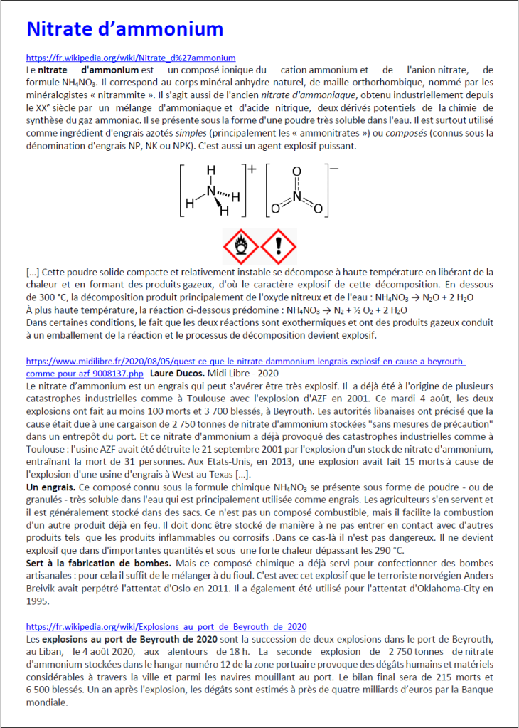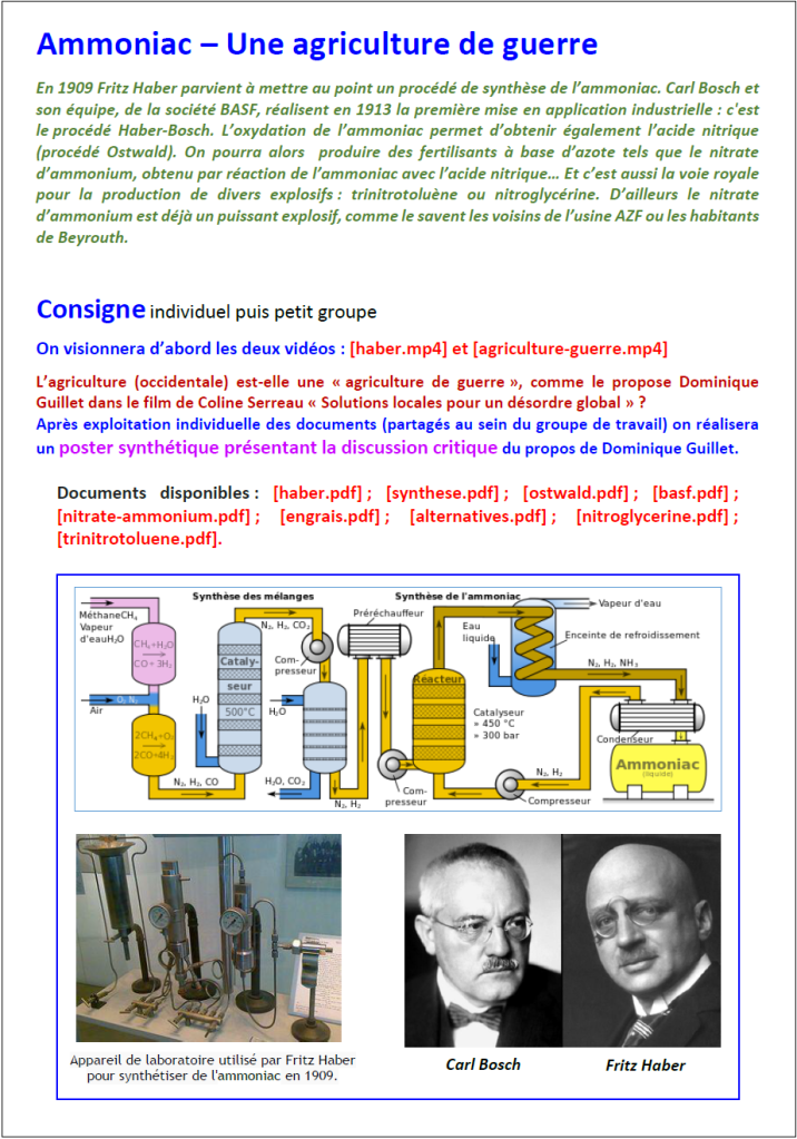 En 1909 Fritz Haber parvient à mettre au point un procédé de synthèse de l’ammoniac. Carl Bosch et son équipe, de la société BASF, réalisent en 1913 la première mise en application industrielle : c’est le procédé Haber-Bosch. L’oxydation de l’ammoniac permet d’obtenir également l’acide nitrique (procédé Ostwald). On pourra alors produire des fertilisants à base d’azote tels que le nitrate d’ammonium, obtenu par réaction de l’ammoniac avec l’acide nitrique… Et c’est aussi la voie royale pour la production de divers explosifs : trinitrotoluène ou nitroglycérine. D’ailleurs le nitrate d’ammonium est déjà un puissant explosif, comme le savent les voisins de l’usine AZF ou les habitants de Beyrouth.