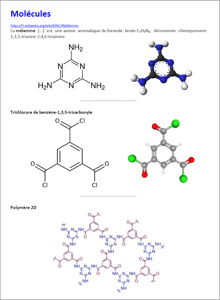 Encore un nouveau polymère ! Sa particularité : une synthèse directe en deux dimensions (au lieu des chaînes linéaires des polymères classiques). Ses propriétés : grandes performances mécaniques, faible densité, imperméabilité aux gaz et liquides…