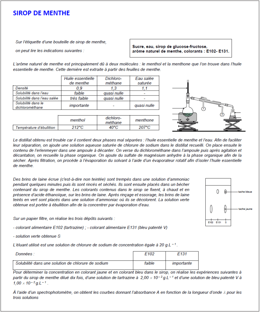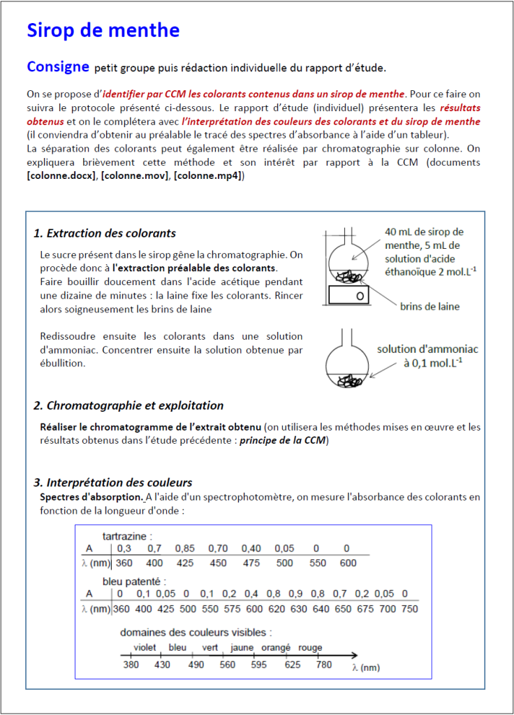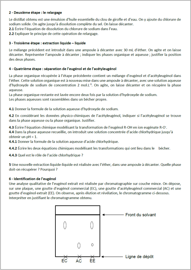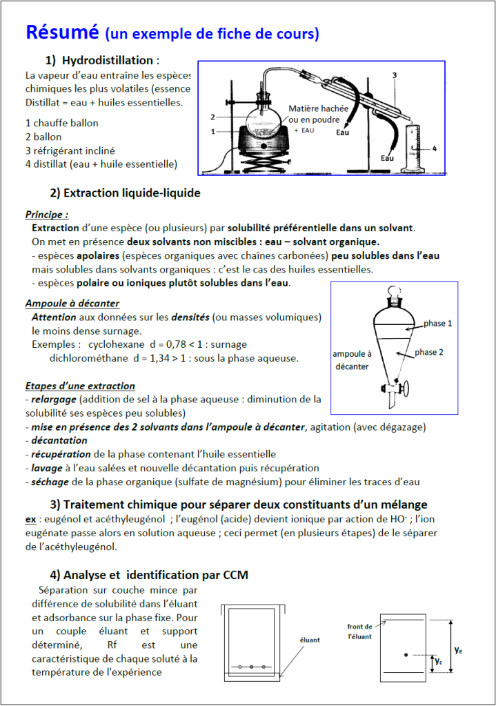 On aborde ici la chromatographie sur couche mince avec trois travaux expérimentaux classiques : les colorants du sirop de menthe, l’eugénol du clou de girofle, le limonène des agrumes. Ce faisant on rencontrera bien sûr les procédés de décoction à reflux, hydrodistillation, extraction…
