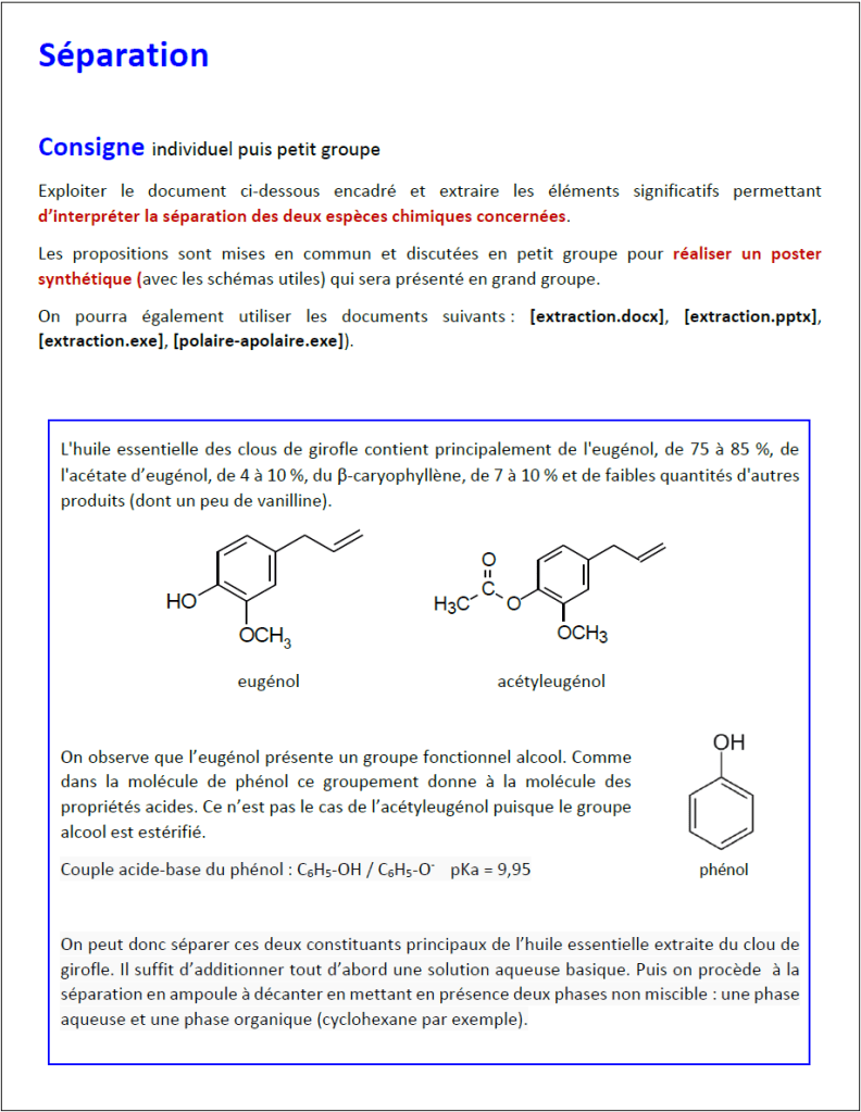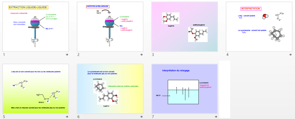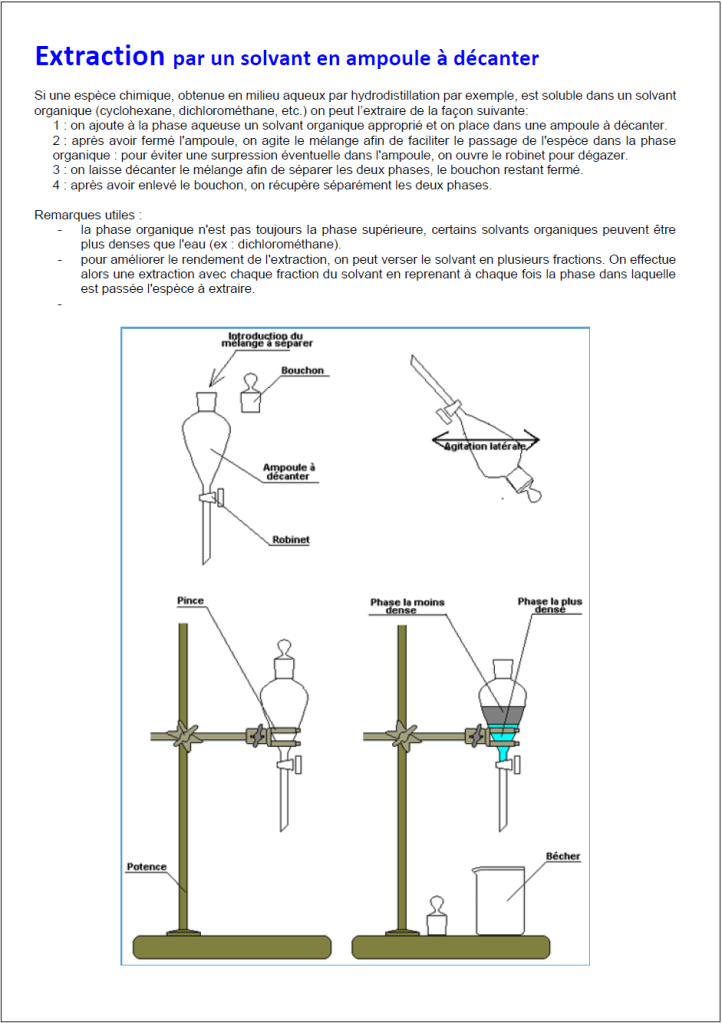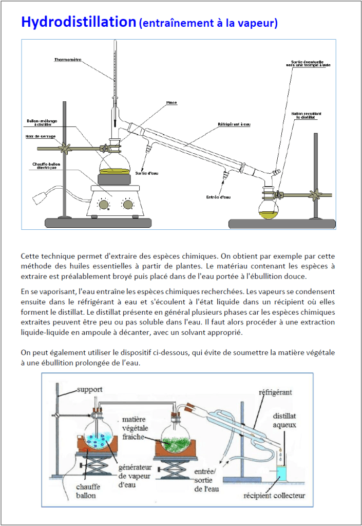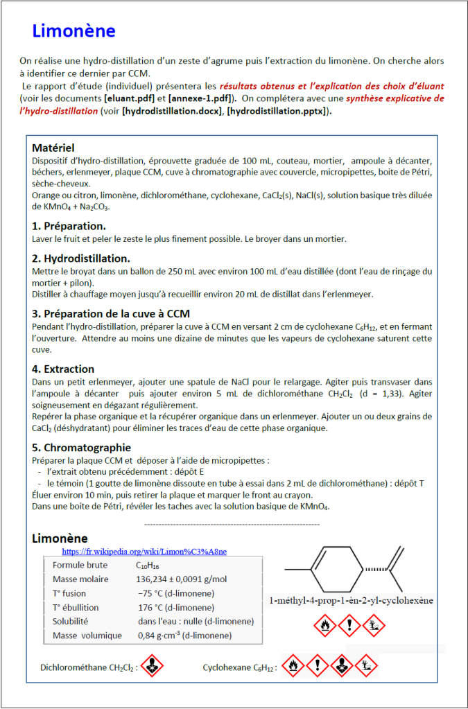 On aborde ici la chromatographie sur couche mince avec trois travaux expérimentaux classiques : les colorants du sirop de menthe, l’eugénol du clou de girofle, le limonène des agrumes. Ce faisant on rencontrera bien sûr les procédés de décoction à reflux, hydrodistillation, extraction…