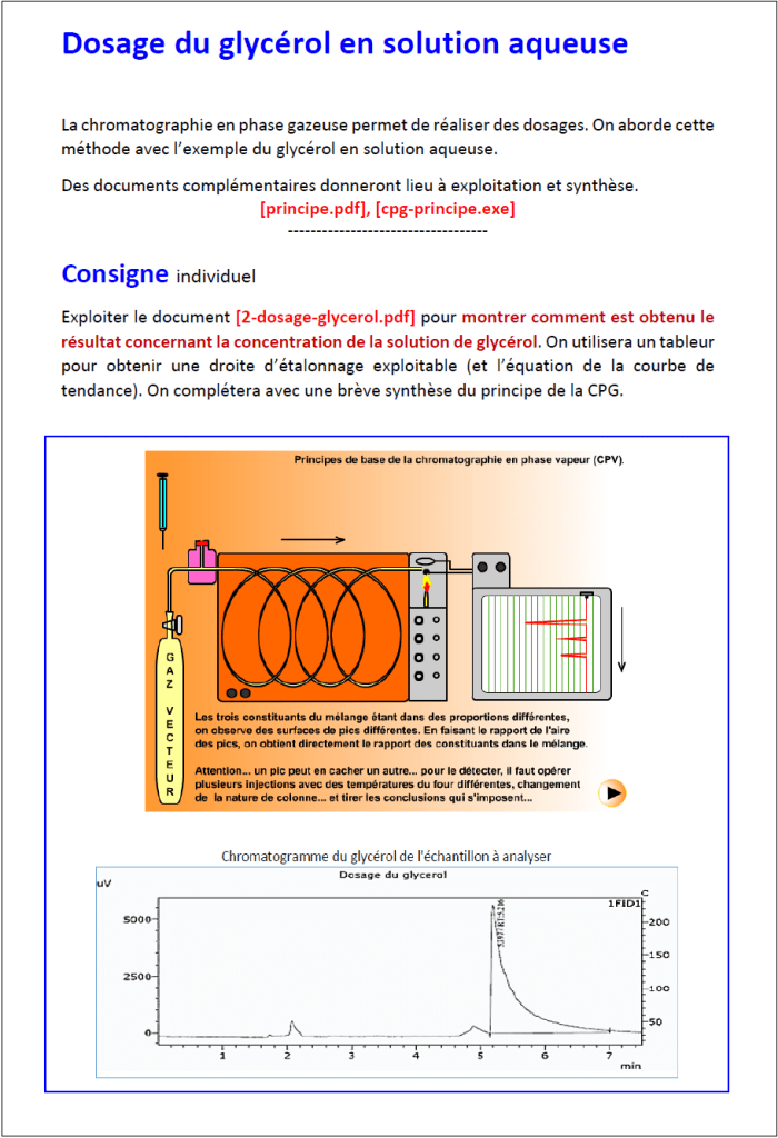 Pour aborder la chromatographie en phase gazeuse on traitera un exemple de dosage du glycérol en solution.