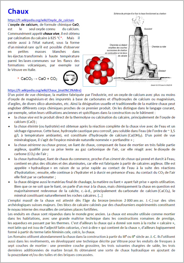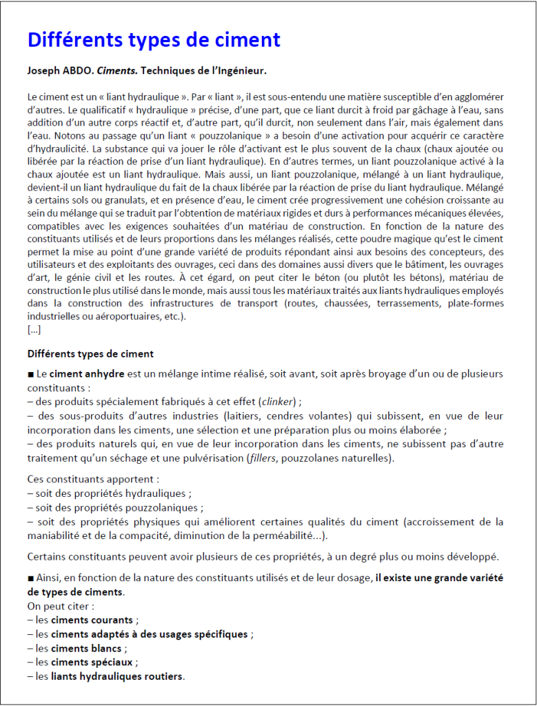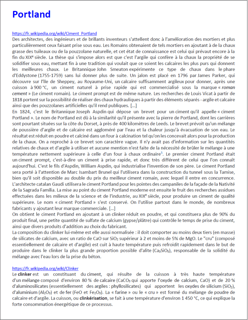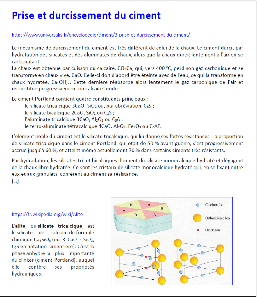 On trouvera ici une petite collection documentaire pouvant donner lieu à exploitation, partagée entre les participants, pour une synthèse : composition, fabrication, prise du ciment, structure au niveau atomique, comparaisons avec les ciments industriels actuels, aspects énergétiques, etc.