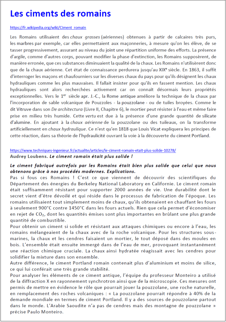 Tous les documents indiqués sont téléchargeables à l’adresse DOCS (dossier ciment romain)