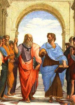 Platon et Aristote – École d’Athènes (détail) – Raphaël. Platon montre le Ciel des Idées. A droite, son disciple Aristote montre la Terre.