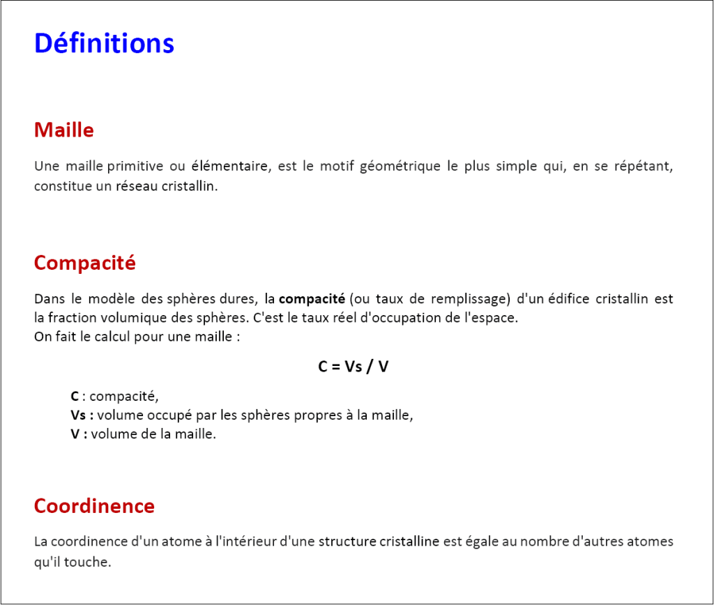 Modèle cristal parfait. On assimile les cations et les anions à des sphères dures (boules de billards) possédant un volume propre, caractérisés par leur rayon ionique, et une charge. La cohésion du cristal est assurée par l’interaction coulombienne entre les ions : elle est attractive entre les ions de mêmes signes, et répulsive sinon. L’interaction coulombienne attractive est forte ce qui implique une énergie de cohésion élevée pour ces cristaux (780 kJ/mol pour NaCl alors que dizaine kJ/mol pour cristaux moléculaires). Dès lors chaque ion s’entoure du nombre maximal d’ions de signe opposé (favorise l’interaction coulombienne). Il y a alors tangence entre anion et cation (sans interpénétration des nuages électroniques). Mais non contact entre les ions de mêmes signes (diminuer l’interaction coulombienne répulsive en 1/r2). En général le rayon ionique anionique (r-) est supérieur au rayon ionique cationique (r+), on parle alors de réseau hôte pour les anions et les cations viennent se placer dans les sites.