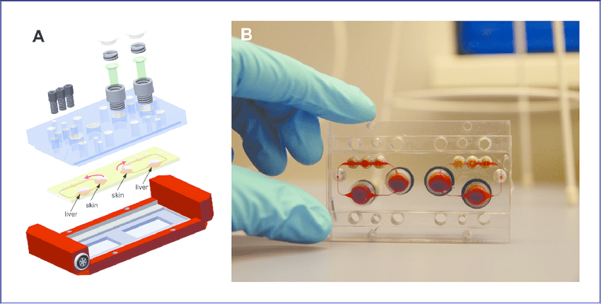Multi-organ chip platform (A) A PDMS chip (yellow), 3 mm high, bonded onto a microscopic slide hosts two independent microcircuits with a circulation channel of 100 x 500 µm. Each channel connects two tissue culture compartments, supporting the integration of 3D tissues, such as cell spheroids, and standard 96-well inserts for reconstructed barrier organ models. A peristaltic onchip micropump (black) enables pulsatile unidirectional fluid flow at physiological frequencies. (B) Represents a worm’seye view of two blood-perfused circuits (reprinted from Marx et al., 2012).