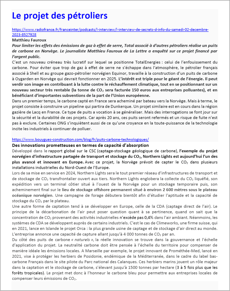 C’est un nouveau créneau très lucratif sur lequel se positionne TotalEnergies : celui de l’enfouissement du carbone. Pour éviter que trop de gaz à effet de serre ne s’échappe dans l’atmosphère, le pétrolier français associé à Shell et au groupe gazo-pétrolier norvégien Equinor, travaille à la construction d’un puits de carbone à Oygarden en Norvège qui devrait fonctionner en 2025. L’intérêt est triple pour le géant de l’énergie. Il peut verdir son image en contribuant à la lutte contre le réchauffement climatique, tout en se positionnant sur un nouveau secteur très rentable (la tonne de CO2 sera facturée 150 euros aux entreprises polluantes), et en bénéficiant d’importantes subventions de la part de l’Union européenne. Dans un premier temps, le carbone capté en France sera acheminé par bateau vers la Norvège. Mais à terme, le projet consiste à construire un pipeline qui partira de Dunkerque. Un projet similaire est en cours dans la région gazière de Lacq en France.