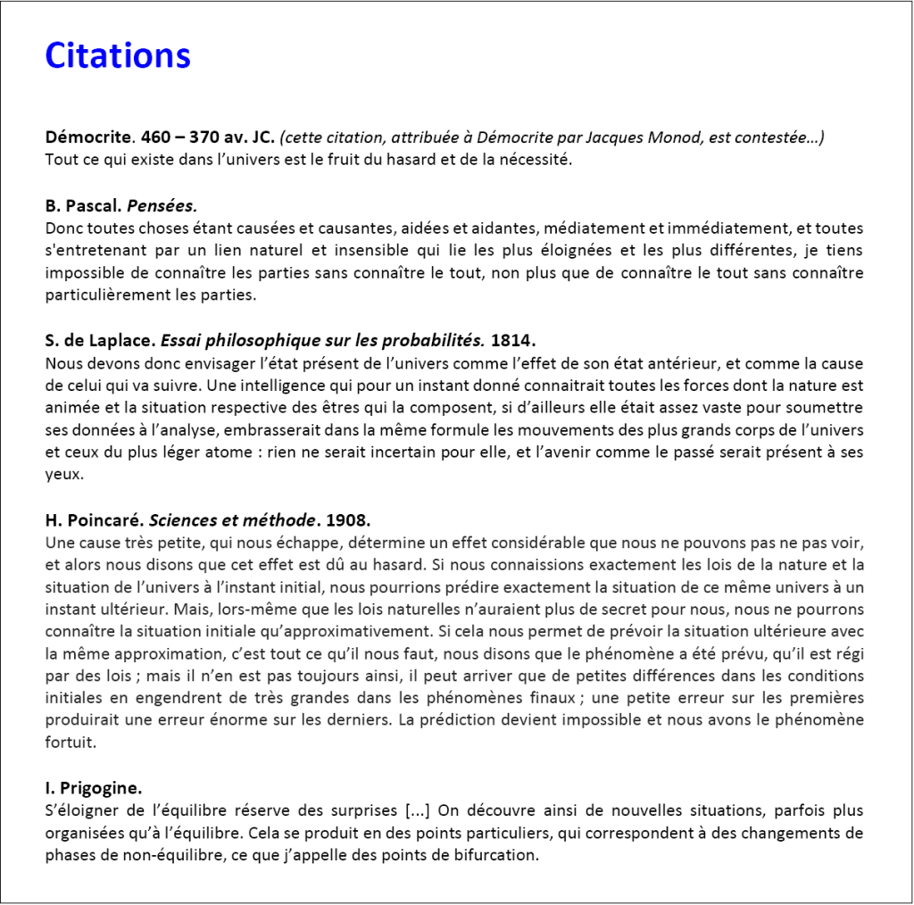 Une cause très petite, qui nous échappe, détermine un effet considérable que nous ne pouvons pas ne pas voir, et alors nous disons que cet effet est dû au hasard. Si nous connaissions exactement les lois de la nature et la situation de l’univers à l’instant initial, nous pourrions prédire exactement la situation de ce même univers à un instant ultérieur. Mais, lors-même que les lois naturelles n’auraient plus de secret pour nous, nous ne pourrons connaître la situation initiale qu’approximativement.
