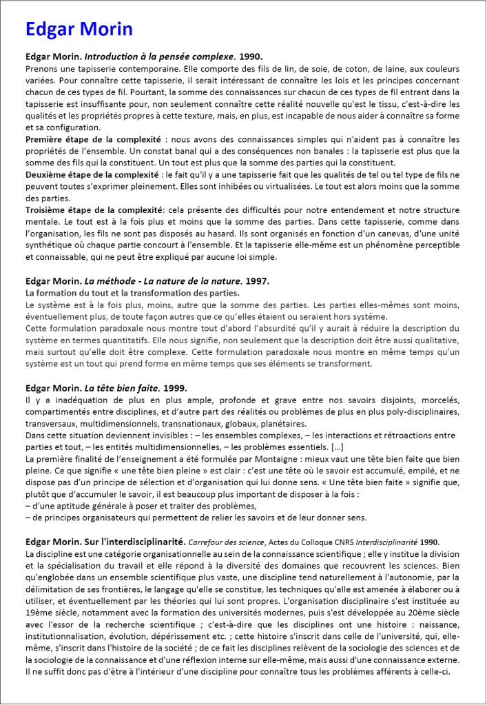 Le système est à la fois plus, moins, autre que la somme des parties. Les parties elles-mêmes sont moins, éventuellement plus, de toute façon autres que ce qu’elles étaient ou seraient hors système. Cette formulation paradoxale nous montre tout d’abord l’absurdité qu’il y aurait à réduire la description du système en termes quantitatifs. Elle nous signifie, non seulement que la description doit être aussi qualitative, mais surtout qu’elle doit être complexe.