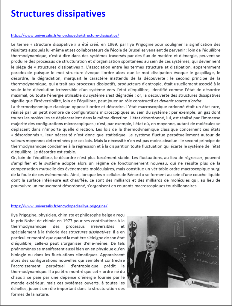 S’éloigner de l’équilibre réserve des surprises […] On découvre ainsi de nouvelles situations, parfois plus organisées qu’à l’équilibre. Cela se produit en des points particuliers, qui correspondent à des changements de phases de non-équilibre, ce que j’appelle des points de bifurcation.
