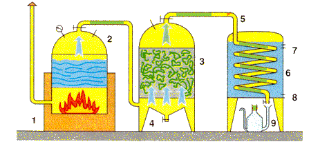 1 Foyer 2 Chaudière 3 Vase à fleurs 4 Vidange de condensation 5 Col de cygne 6 Réfrigérant avec serpentin 7 Sortie d’eau chaude 8 Arrivée d’eau froide 9 Essencier