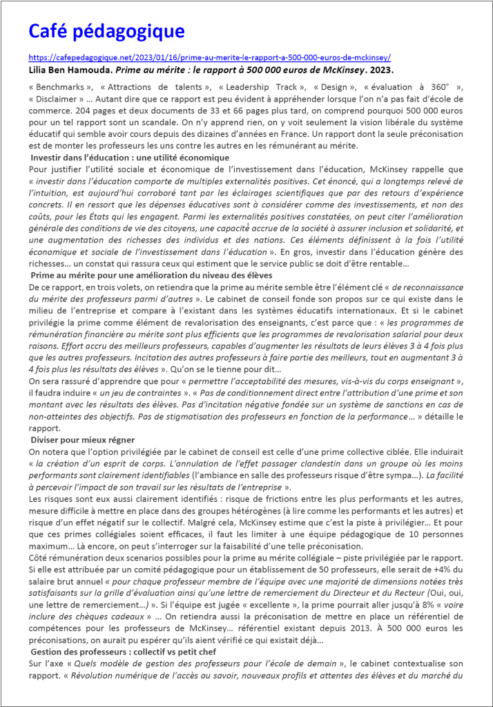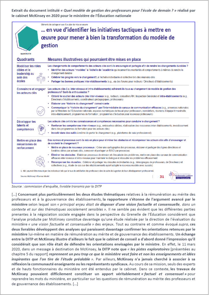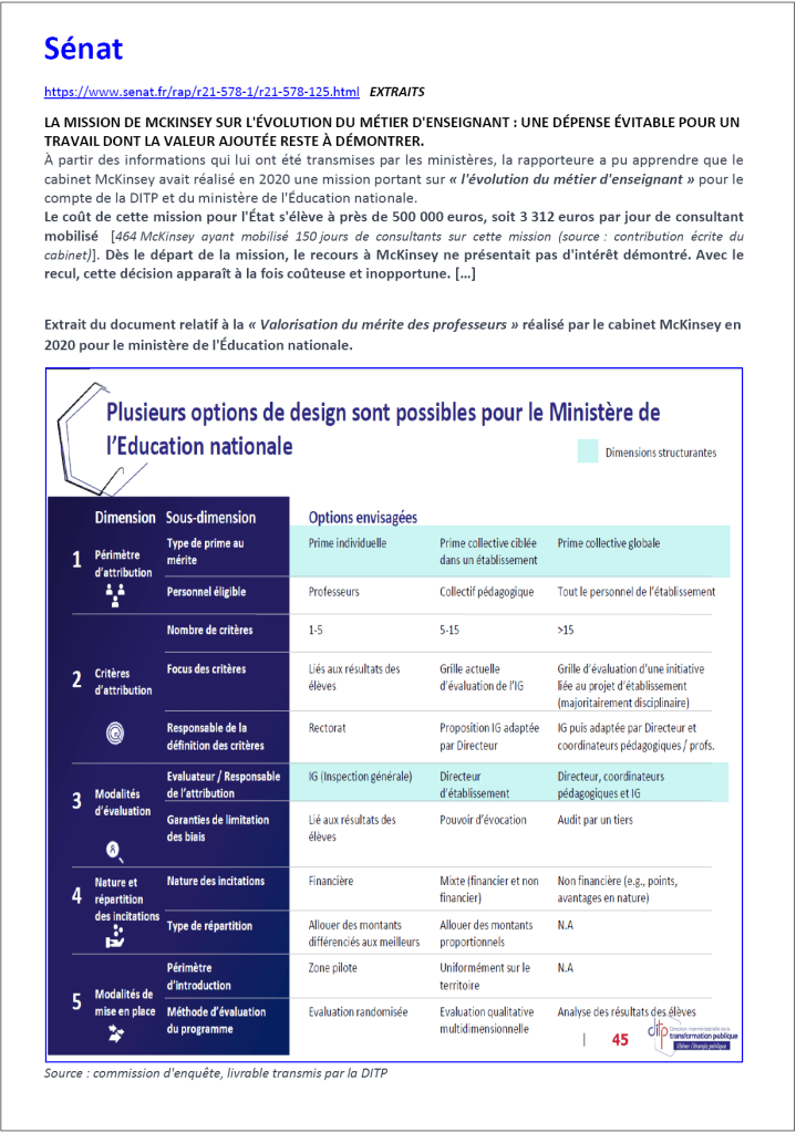 Le rapport de McKinsey sur l’évolution du métier d’enseignant (2020), destiné à la DITP et au Ministère de l’Éducation Nationale, a couté 496 800 euros. Voici une petite collection de documents…
