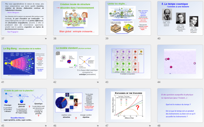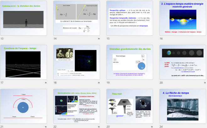 La flèche du temps ; Complexité ; Relativité ; Relativité (1) – Éther ; Relativité (2) – Muon ; Relativité (3) – E = ??? ; Relativité (4) – Courbure ; Corrections relativistes ; Relativités ; Radioactivité (2) – Datations ; Datations ; Temps atomique ; Big Bang ; Les gardiens du temps ; Pendule ; L’horloge ; La révision du Si