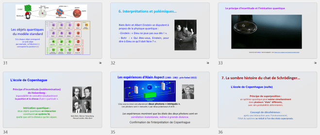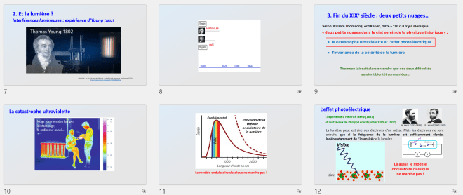 Quantique (1) – Catastrophe UV ; L’effet photoélectrique ; Photon – matière ; Quantique (2) – Quantum ; Quantique (3) – Atome ; Quantique (4) – Quanton ; Dualité ? ; L’atome de Bohr ; Interprétations quantiques ; Lectures quantiques ; Spectro (1) – Spectres