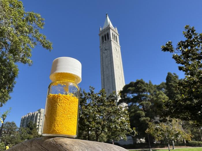 CAPTION A vial of COF-999, which is yellow, with UC Berkeley’s landmark campanile in the background. CREDIT Zihui Zhou, UC Berkeley.