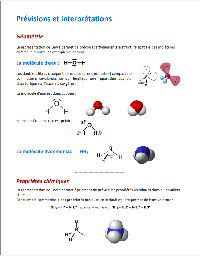 La structure de Lewis consiste à définir la localisation des électrons sur ou entre les atomes de la molécule. Seuls les électrons de valence sont considérés. On obtient ainsi une certaine vision de la structure électronique de la molécule par ses doublets libres, ses doublets liants (liaisons σ et π), ses lacunes et ses éventuels électrons célibataires (dans le cas des radicaux). Dans cette représentation, les électrons célibataires sont notés par des points et les paires d’électrons par des traits (plus rarement par deux points). Les traits peuvent être localisés sur un atome (doublet libre ou non liant) ou entre les atomes (doublet liant, liaison covalente).