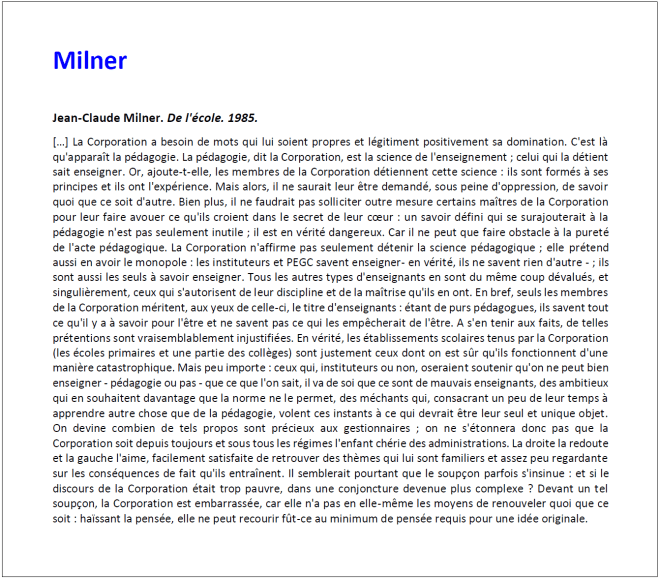 Il y a, tout d’abord, un vieux préjugé français qui frappe d’une sorte de discrédit la pédagogie d’une manière générale. Elle apparait comme un mode très inférieur de spéculation. Par suite de je ne sais quelle contradiction, alors que les systèmes politiques nous intéressent, que nous les discutons avec passion, les systèmes d’éducation nous laissent assez indifférents, ou même nous inspirent un éloignement instinctif. […] Je ne m’arrêterai pas à montrer combien cette espèce d’indifférence et de défiance est injustifiée. Il y a des vérités sur lesquelles on ne saurait indéfiniment revenir. La pédagogie n’est autre chose que la réflexion appliquée aussi méthodiquement que possible aux choses de l’éducation. Comment donc est-il possible qu’il y ait un mode quelconque de l’activité humaine qui puisse se passer de réflexion ? Aujourd’hui, il n’y a pas de sphère de l’action où la science, la théorie, c’est-à-dire la réflexion ne vienne de plus en plus pénétrer la pratique et l’éclairer. Pourquoi l’activité de l’éducation ferait-elle exception ?