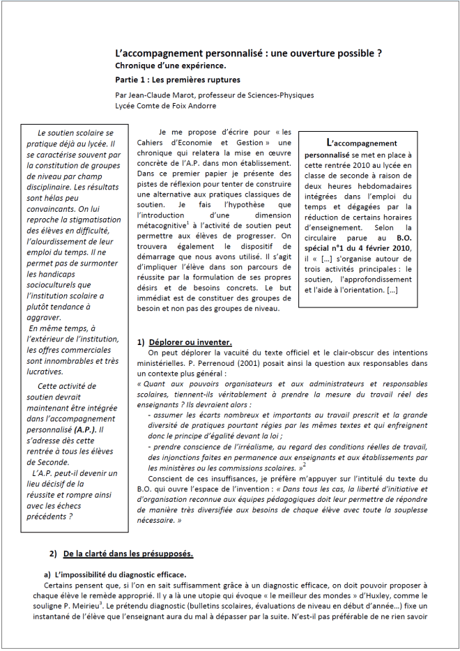 Les articles AP (1, 2, 3, 4 et 5) relatent une expérience de mise en œuvre de l’accompagnement personnalisé à ses débuts.