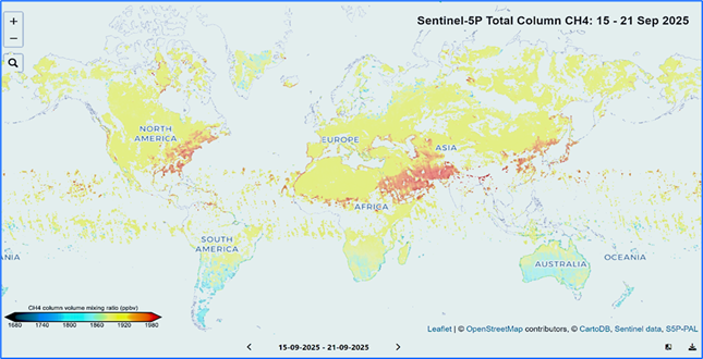 This online platform uses data from the Copernicus Sentinel-5P satellite and shows the averaged methane concentrations across the globe — using weekly averaged maps. Cette plateforme en ligne utilise les données du satellite Copernicus Sentinel-5P et montre les concentrations moyennes de méthane à travers le monde, à l’aide de cartes moyennes hebdomadaires.