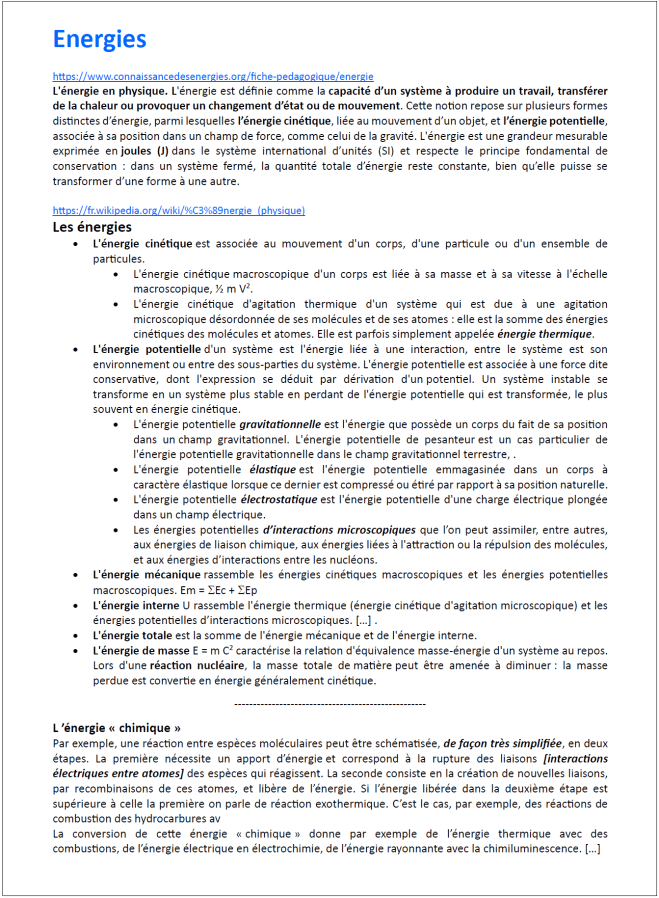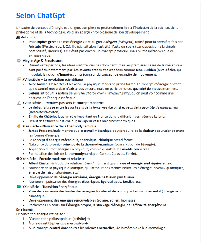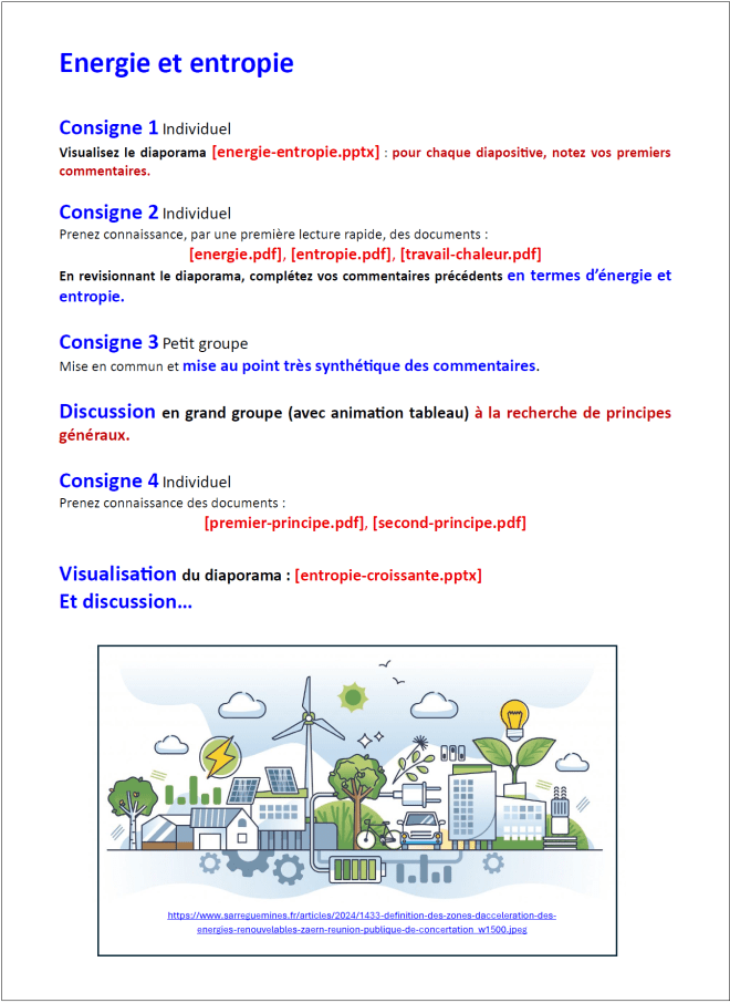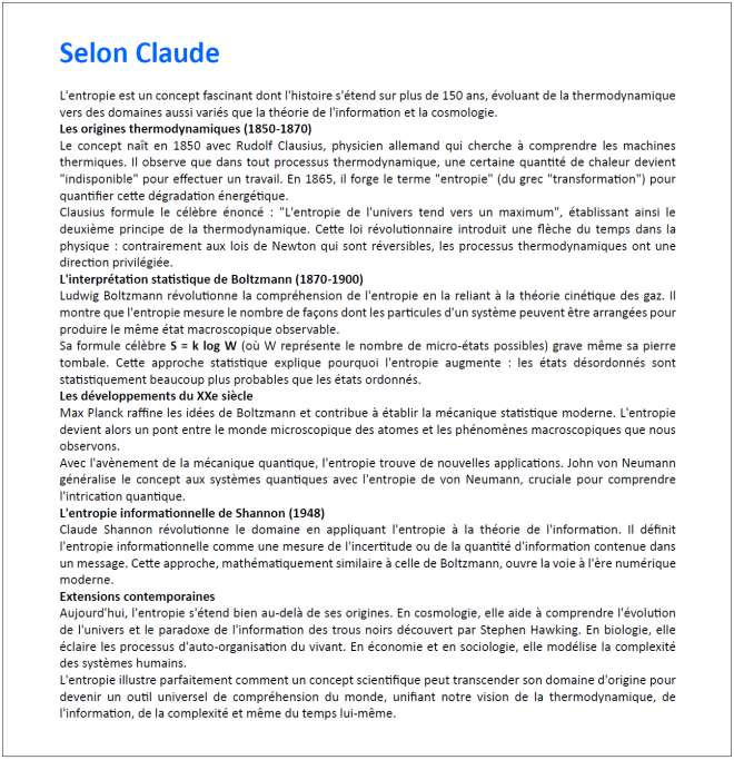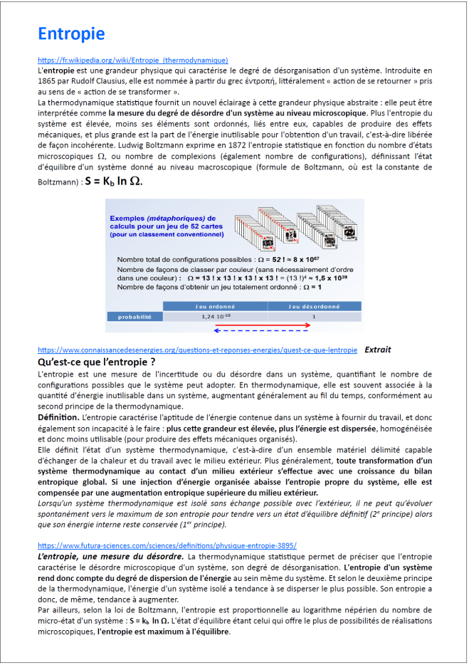 Il y a urgence à travailler les concepts et le langage approprié ! Comme l’indique Etienne Klein, nous ne consommons pas de l’énergie ; nous la transformons, et ce faisant nous créons de l’entropie, c’est-à-dire du désordre. Il faut encore préciser que lorsque nous créons des structures (de l’organisation, de « l’ordre »), nous provoquons une désorganisation (un « désordre ») encore plus grand dans l’environnement… C’est le second principe de la thermodynamique, cette branche fondamentale des sciences physiques qu’il faudrait introduire dans l’enseignement, dès le collège et le lycée…